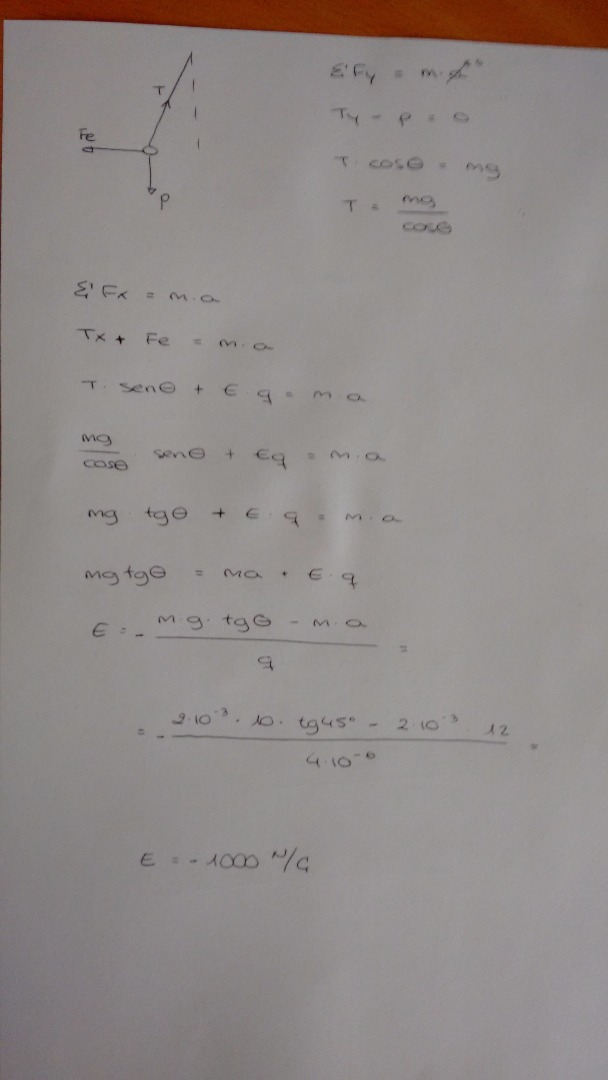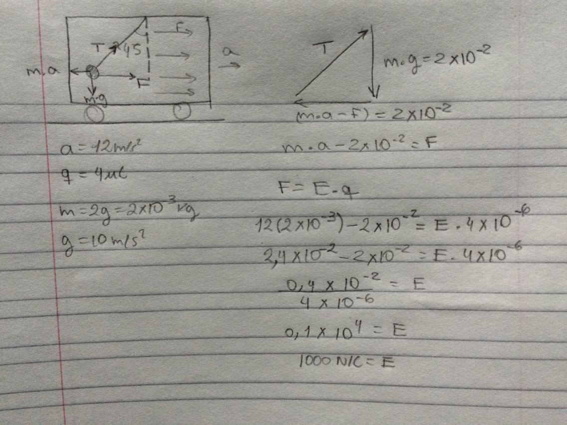 Le recomiendo que trabaje en los diferentes ejes por separado. Así, le hago un pequeño resumen del ejercicio. El coche se mueve en el eje OX con una aceleración (12m/s²) pero en el eje OY no hay ninguna aceleración. Entonces, el sumatorio de las fuerzas del eje vertical es cero (Ty - p = 0) quedando la tensión como único valor desconocido ( T = mg / cosΘ ). En el eje horizontal, el sumatorio de las fuerzas es igual a la masa por la aceleración (Segunda Ley de Newton F = m a ). Las fuerzas de ese eje son la tensión y la fuerza eléctrica. Como la fuerza eléctrica va dirigida hacia la izquierda y la carga es positiva, la fuerza eléctrica irá en el sentido negativo del eje OX. Quedando como sumatorio (Tx - Fe = m a). Sustituyendo la tensión que hemos hallado anteriormente podemos encontrar el campo ( - E = (mg*tgΘ - ma) / q ) que será de 1000 N/C en el sentido negativo del eje horizontal.