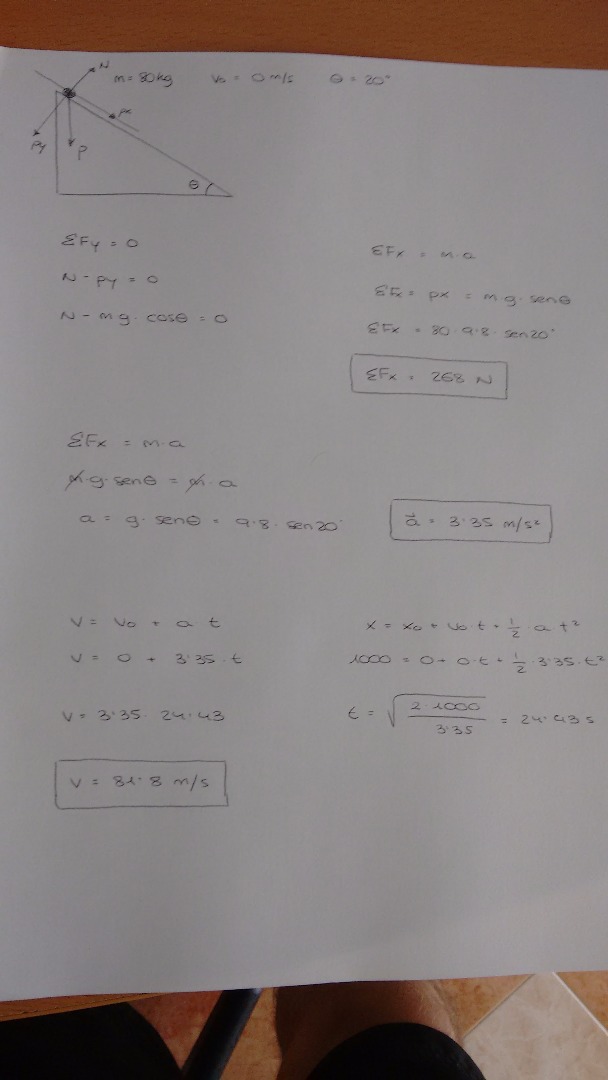 Para saber la velocidad final con la cual llegará el esquiador después de una rampa de 1km de recorrido, se puede hacer de dos formas distintas: por energías o por cinemática. Lo he resuelto por cinemática porque me parece más fácil y es lo primero que se enseña en la escuela. Como hay una aceleración en el movimiento del esquiador se trata de un MRUA (movimiento rectilíneo uniformemente acelerado) y tenemos dos ecuaciones relacionadas (una de posición y otra de velocidad) con las cuales se puede saber el tiempo que emplea el esquiador en llegar al final de la rampa, y la velocidad que lleva en ese momento.