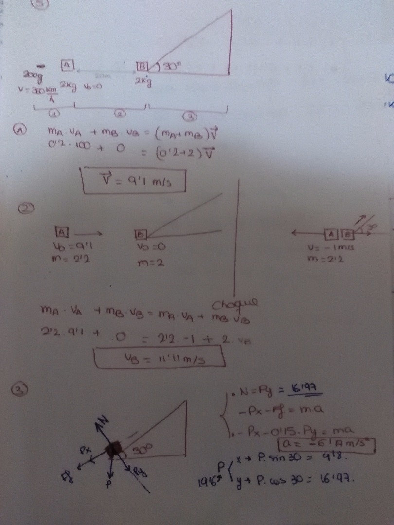 Dos objetos A y B de 2Kg cada uno se encuentran separados 20m tal y como se ve en la figura. Un proyectil de 0.2Kg que se mueve a 360km/h impacta de manera inelastica con el objeto A. Este acaba colisionando con el B, que está en la base de un plano inclinado 30º . Después de la colisión, el A se mueve a 1m/s hacia la izquierda. Si sabemos que el coeficiente de fregamiento es de 0.15 en todos los movimientos, a que altura sobre la horizontal llegara el B ?