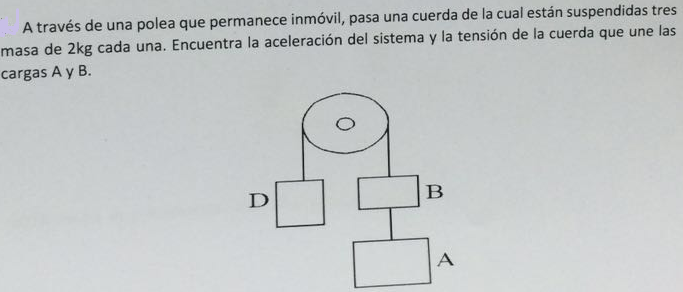 Tengo este ejercicio y tengo el valor de las masas me pide hallar la aceleración del sistema y la tensión de la cuerda que une A y B pero no entiendo como hacer eso de antemano gracias al que me pueda ayudar en este ejercicio!