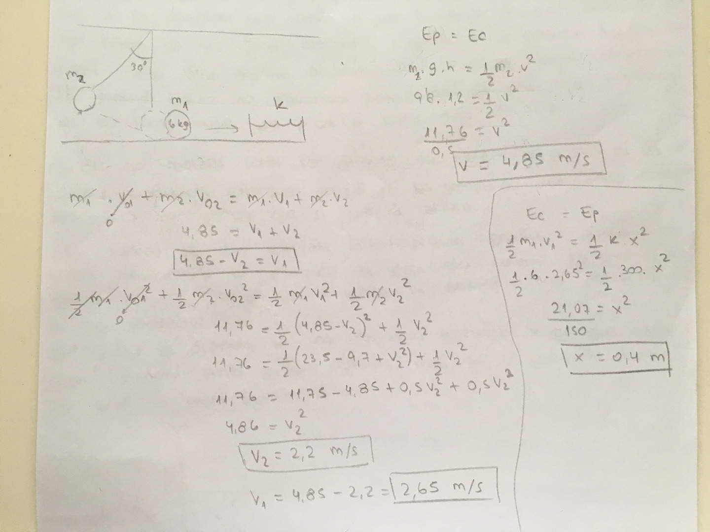 Una bola ligada con un cordón de 120 cm se deja ir desde un angulo de 30º de manera que cuando llega al punto mas bajo de la trayectoria (justo cuando el hilo esta vertical) choca con otra bola de masa de 6 kg que estaba parada con un choque elástico. Esta segunda bola se desliza por un plano horizontal sin fregamento y comprime un muelle de constante 300 N/m. Calcula la compresión que experimentará el muelle.
