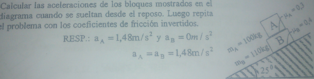 Calcular las aceleraciones de los bloques mostrados en el diagrama cuando se sueltan desde el reposo. Luego repita el problema con los coeficientes de fricción invertidos. quisiera que alguien me pueda ayudar porque no lo entiendo nose como empezar mejor dejo una imagen para que este mas claro de antemano agradezco al que me ayude