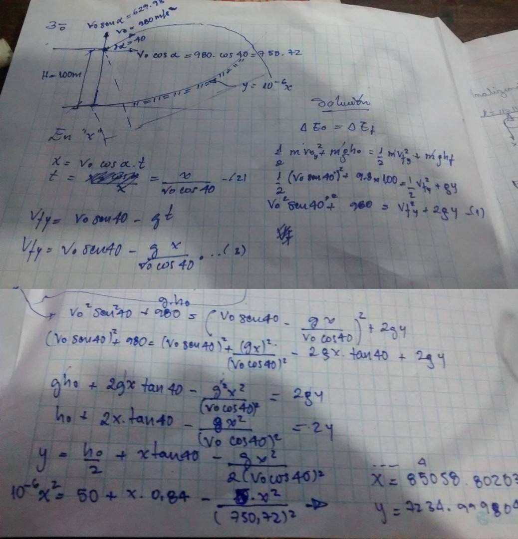 Se dispara un proyectil con una velocidad inicial de V0=980m/s y un angulo de 40°. Que altura a partir del plano que pasa por el arma, chocara el proyectil contra la colina, siendo que esta tiene la forma dado por la ecuacion y=10^-6*x^2