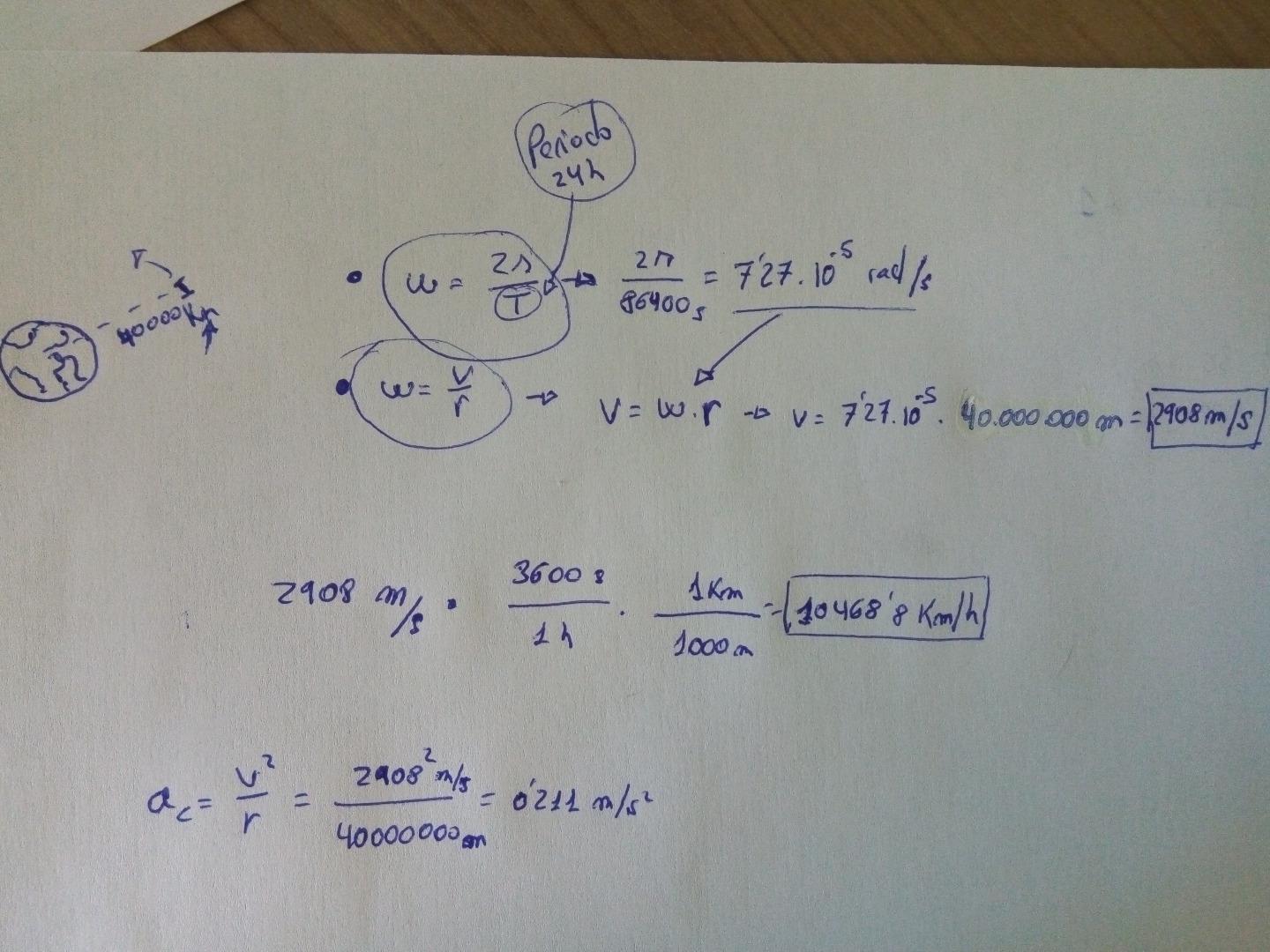 Hola, podeis ayuderme: Un satélite de comunicaciones gira en torno a la Tierra a 40000 km de su centro. Si tiene la misma velocidad angular de rotación que nuestro planeta (satélite geoestacionario), determina su velocidad lineal de rotación referida al centro de la Tierra en m/s y en km/h. ¿Cuál es su aceleración centrípeta?