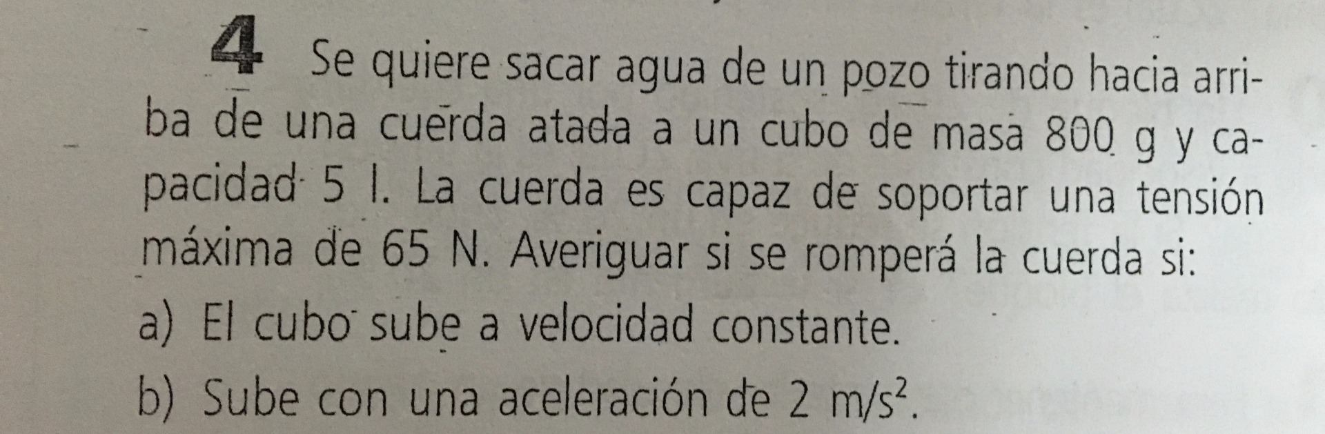 Comencemos : para el Literal A) W=T por lo tanto mg=T entonces ahora el problema es la masa masa del valde=(800/1000 Kg) masa del Agua= (5)kg como puedes observar los litros lo transforme a kg primero 1000L=1 m3 1T=1m3 y 1T=1000kg entonces 1000kg=1m3 entonces 1000kg=1000 L entonces 1kg=1L ahora reemplazamos datos Wv=(0.8+5)kg*10m/s^2 Wv=58 N T=58 y como la tensión que puede resistir la cuerda es de 65N si resiste