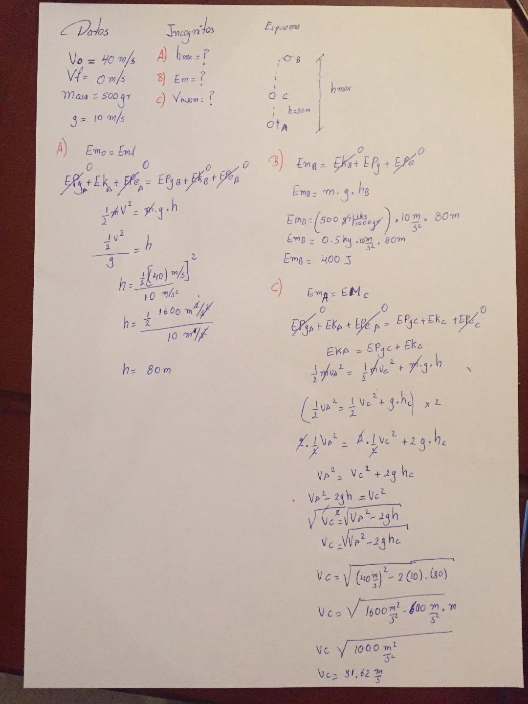 c) Su velocidad cuando está a altura 30 metros.
