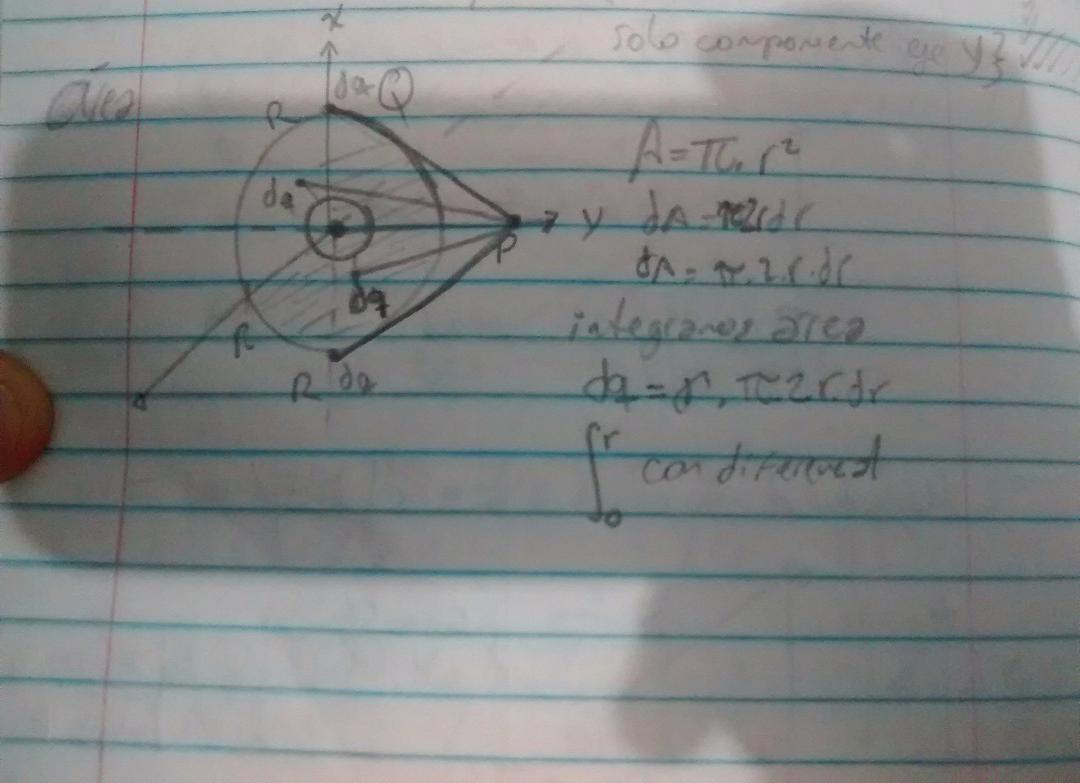 FISICA II, AYUDA CON UN PROBLEMA DE CAMPO ELECTRICO. TENGO QUE HALLAR ESTA AREA CON LIMITE DE INTEGRACION de 0 a r(radio), pero no se que ahcer. Solo tengo que evalularlo en componente Y, ayuda, estoy frustrado no se como comenzar, gracias por la atencion profesores!