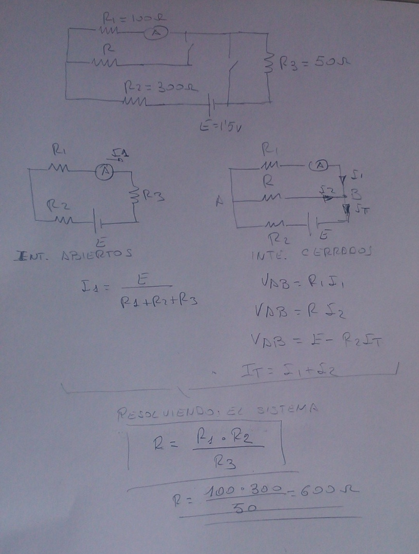 Buenas tardes!, he estado intentando hacer este ejercicio, básicamente piden por medio de kirchoff hallar la resistencia R, quisiera saber si de esta manera esta bueno, separe en dos mallas e iguale las corrientes para luego despejar R. si hay algún error o todo esta malo, de que manera se resuelve?? Gracias :)