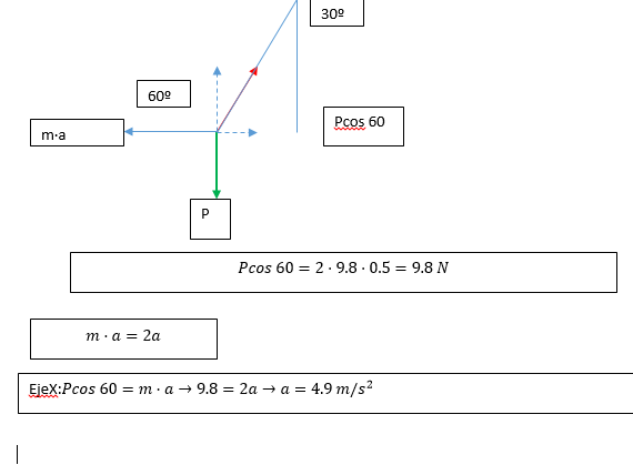 Un hombre que va en un tren observa que un candelabro suspendido del techo forma un angulo de 30 grados con la vertical. El candelabro pesa 2kg y esta suspendido de una cuerda de 20 cm de largo. la aceleración del tren es: