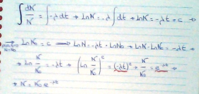 Intento demostrar la ecuación N=No e^(λt) partiendo de -dN/dt=λN, lo hicimos una vez en clase, y entiendo todo hasta el paso que está subrayado, ¿alguien sabe explicármelo?