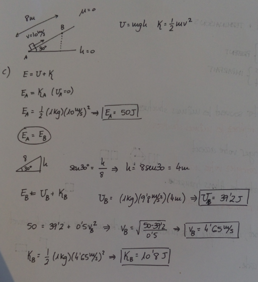 Se lanza un bloque de 1kg de hielo a una velocidad de 10m/s por una rampa, hacia arriba. Si la pendiente de la rampa es de 30º y no hay rozamiento determina: