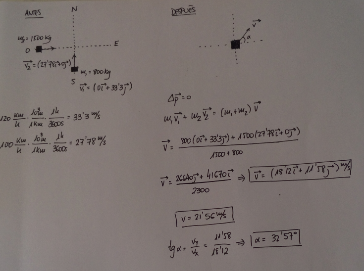 Hola David, necesitaría ayuda con este problema. Es de dinámica. Un coche de 800 kg se mueve hacia el norte con una velocidad de 120 km/h y choca en un cruce con una camioneta de 1500 kg que se mueve a 100 km/h hacia el Este. Después del choque se enganchan los dos vehículos y forman un único bloque. ¿Cuál será su velocidad? Indica módulo y dirección.