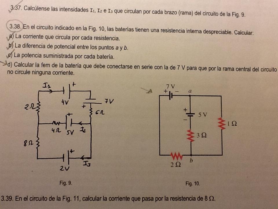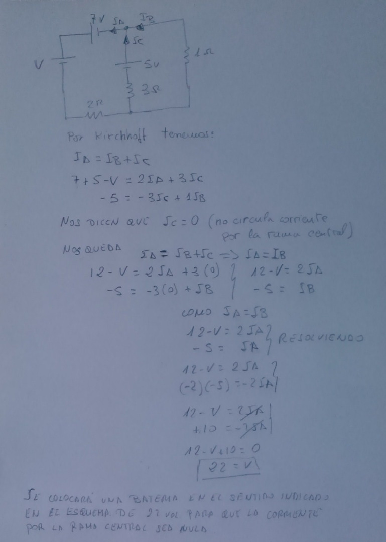 Una vez has eliminado la rama central, te quedará un circuito con dos resistencias, un fuente de tensión de 7 V y la otra fuente de tensión que tienes que incorporar. Entonces, aplicando Kirchhoff tenemos que: -ε1(7 V) + ε2(fuente que se tiene que incorporar) = (-2 ohmios * I) + (-1 ohmios * I);