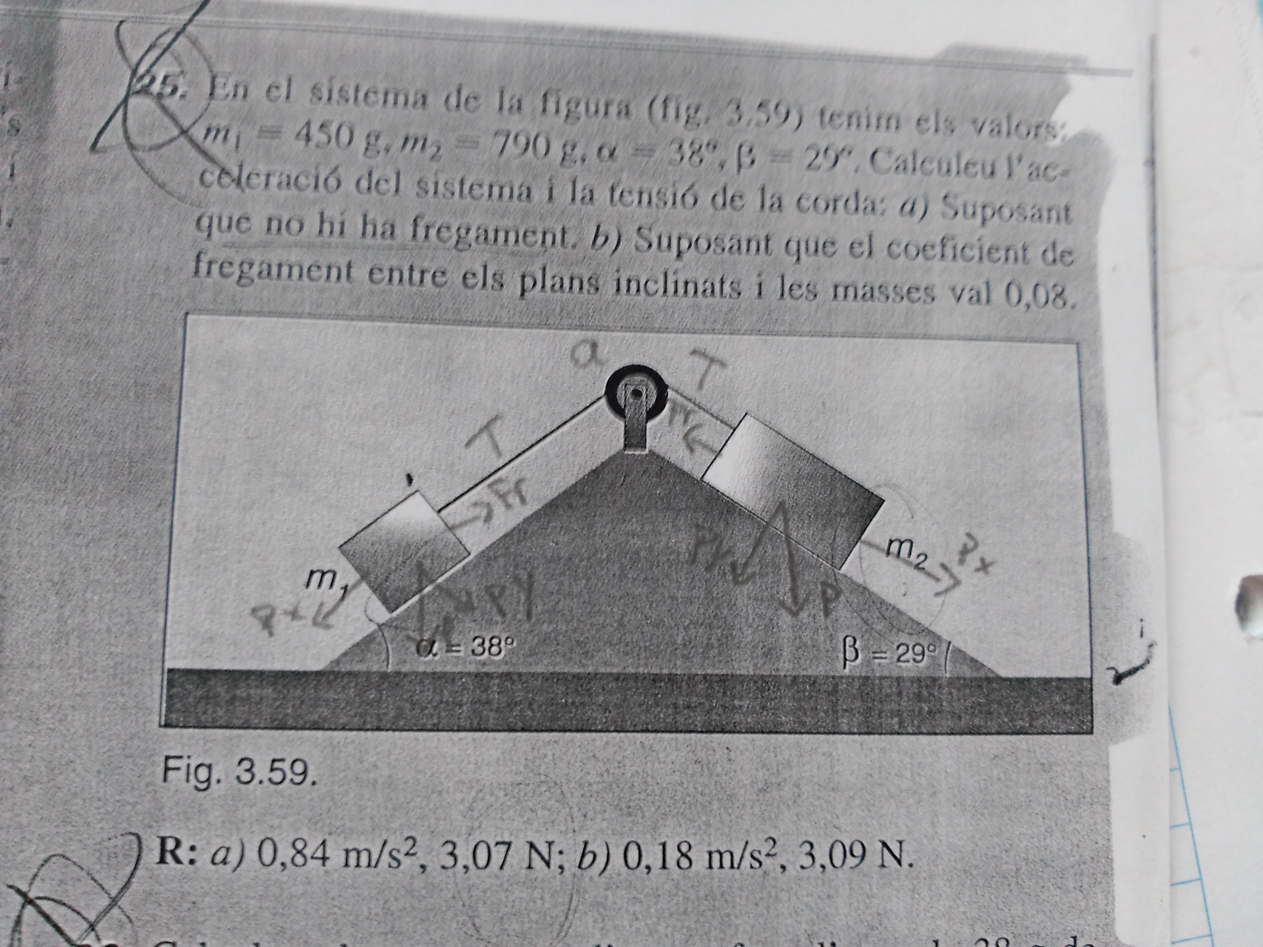 En un sistema tenemos los valores: m1=450g, m2=790g, α=38º, β=29º. Calcular la aceleración del sistema y la tensión de la cuerda: