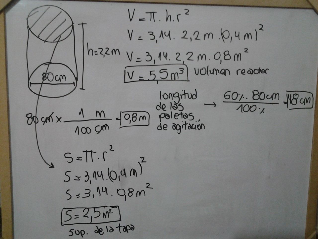 Hola chicos, necesito que alguien me corrija este ejercicio, ya lo resolvi pero nose si esta bien , el enunciado es: " Calcular el volumen de un reactor de mezcla completa que tiene una altura de 2,2 m y un diametro de 80 cm. Calcular también la superficie de la tapa considerándola plana,. La longitud de las paletas de agitacion corresponden al 60% del diametro del tanque, calcular en pl y ft