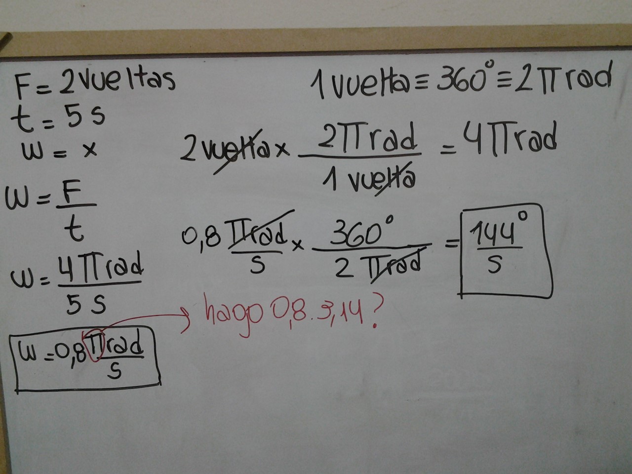 Este ejercicio también lo resolví , quería saber si tenia algún error Y SI TENGO QUE MULTIPLCAR 0,8 POR 3,14 QUE VALE PI O QUEDA PI RADIAN ????? enunciado dice : " UN MOVIL CON MOVIMIENTO CIRCULAR UNIFORME TARDA 5 SEGUNDOS EN DAR 2 VUELTAS. CALCULAR SU VELOCIDAD ANGULAR EN GRADOS/SEGUNDO Y RADIANES/SEGUNDO . GRACIAS