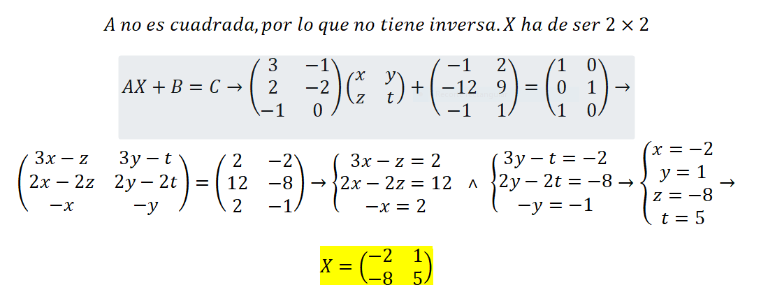 Luego, debes plantear el producto A*X (observa que te quedará una matriz de tres filas y dos columnas, cuyos elementos son expresiones con incógnitas), debes resolver la resta B - C, para luego igualar elemento a elemento, y tendrás un sistema de seis ecuaciones lineales, de primer grado y con cuatro incógnitas, que deberás resolver.
