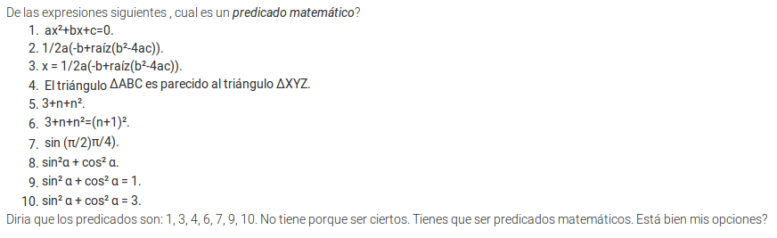 El 1,3,6,9 y 10 son predicados matemáticos (fallas al decir que 4 y 7 lo son), aciertas en los demás y al decir que no tienen porque ser ciertos/verdaderos/tautología