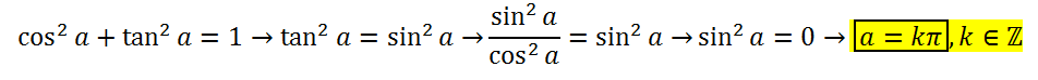cos^2(a)+tg^2(a)=1 Cuando es cierta la igualdad?