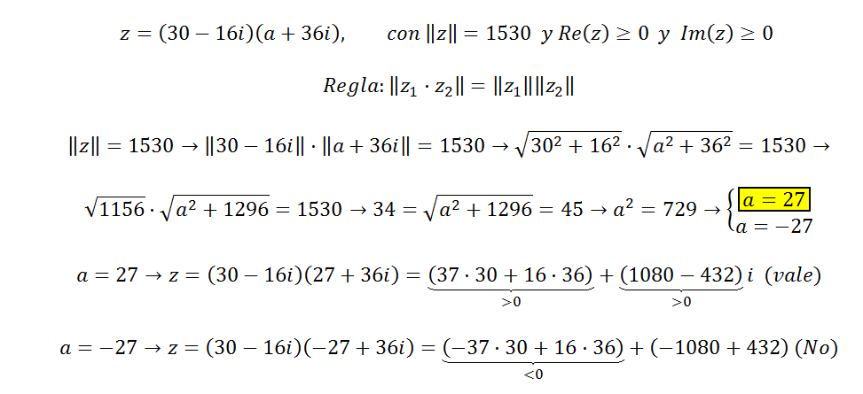 Hola, me gustaría saber que formula se utiliza para hallar el valor de a sabiendo el modulo, en este caso és: (30-16i)*(a+36*i)=1530.