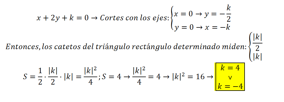 Calcula el valor de K, sabiendo que el triángulo cuyo vértices son el origen de coordenadas y los puntos en los que la recta s: x+2y+k=0 corta a los ejes de coordenadas y tiene por área 4u2