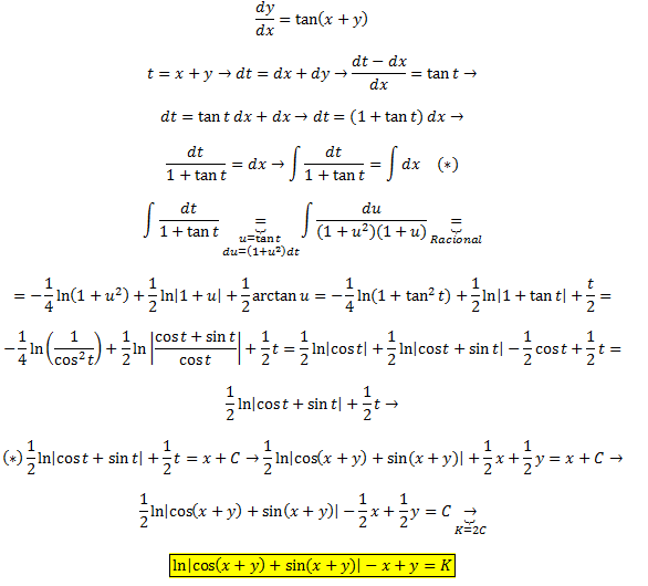 y´=tan(x+y)            solucion:ln|1+sen2(x+y)|+2y-2y=c
