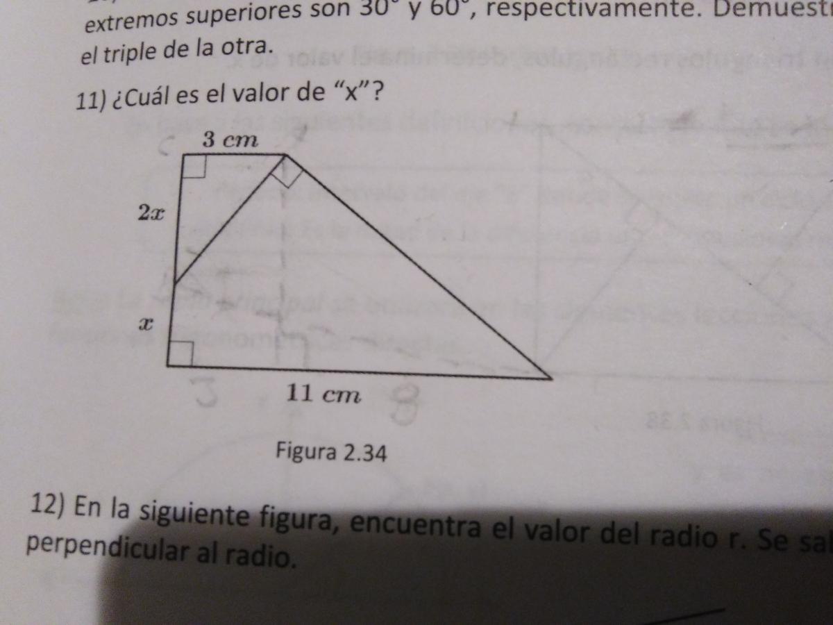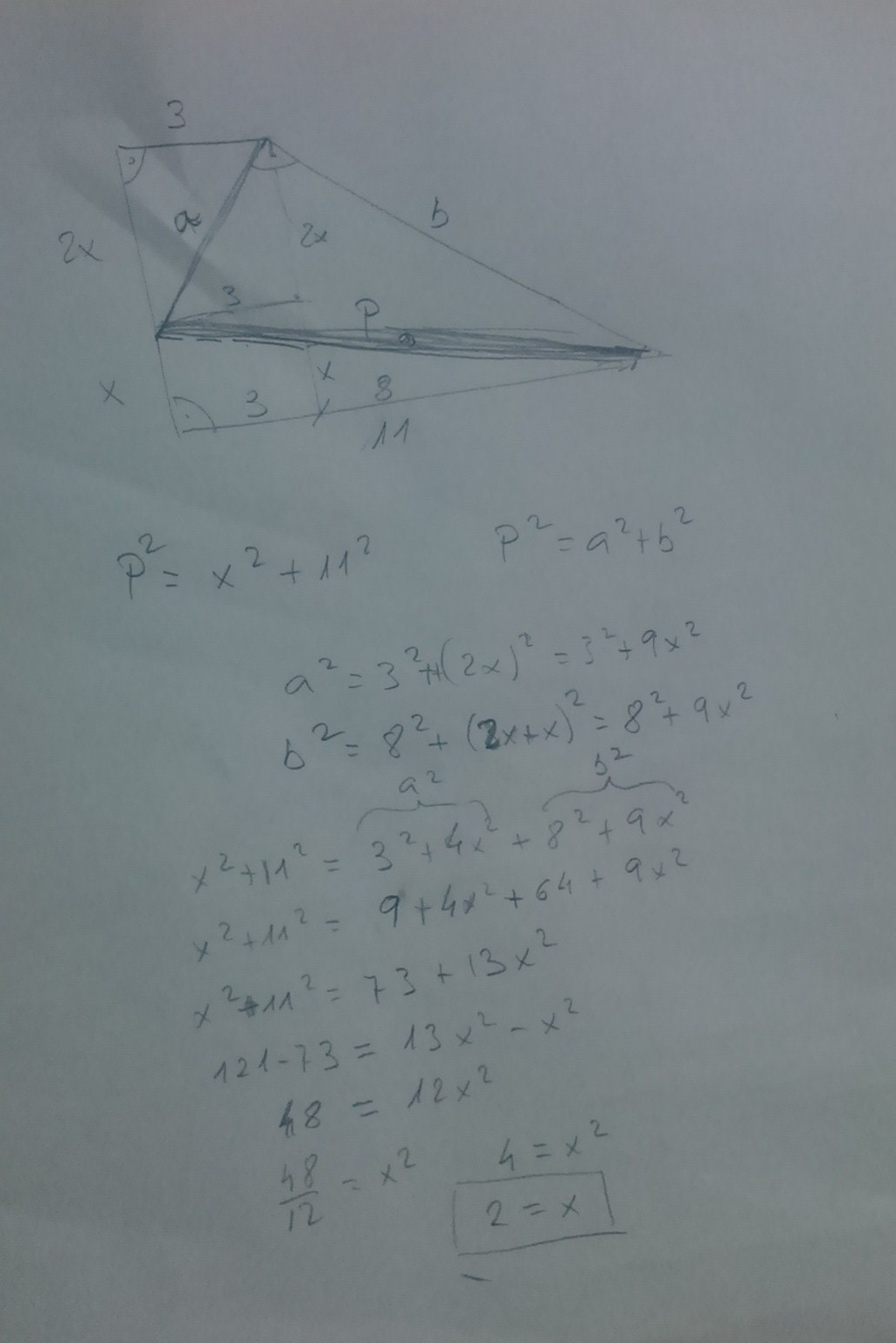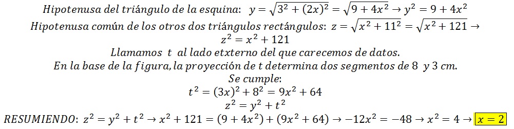 Luego, traza un segmento vertical desde el extremos derecho del segmento de longitud 3 cm hasta cortar a la base de la figura (cuya longitud es 11 cm), y te queda determinado a su derecha un triángulo rectángulo cuya base mide: (11 - 3) cm = 8 cm, y su altura mide: x + 2x = 3z, luego para este triángulo (llamamos B a la longitud de su hipotenusa) tienes: