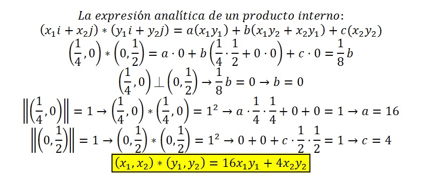 hola buenas tardes, tengo una duda sobre un ejercicio que tengo que resolver donde me piden que calcule un producto interno para el cual los vectores (1/4, 0) y (0, 1/2) sean una base ortonormal.. me podrian ayudar? mas que nada con una explicacion de como hacerlo porque tengo mas ejercicios similares y es fundamental que logre comprender lo que hago y no mecanizarme , desde ya se agradece la ayuda!