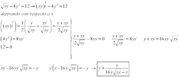 Muy buenas! Estoy en la asignatura de cálculo y he de derivar de forma implícita la siguiente función: (xy)^1/2-4y^2=12
