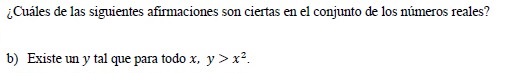 Por lo tanto tenemos que la función cuya expresión toma valores cada vez mayores a medida que x tiende a +infinito o a -infinito, por lo que no existe una cota superior para su imagen, por lo que no existe un número real y tal que, para todo x perteneneciente a los reales, y sea mayor que x^2.