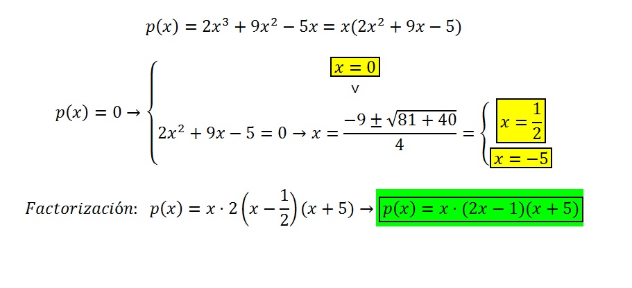Recuerda que debes consignar el coeficiente principal, ya que la fórmula resolvente para las ecuaciones polinómicas cuadráticas solamente te sirve para encontrar las raíces, y también, recuerda que toda expresión polinómica con término independiente igual a cero, como en este caso, tiene una de sus raíces iguales a cero, por lo tanto las raíces son: