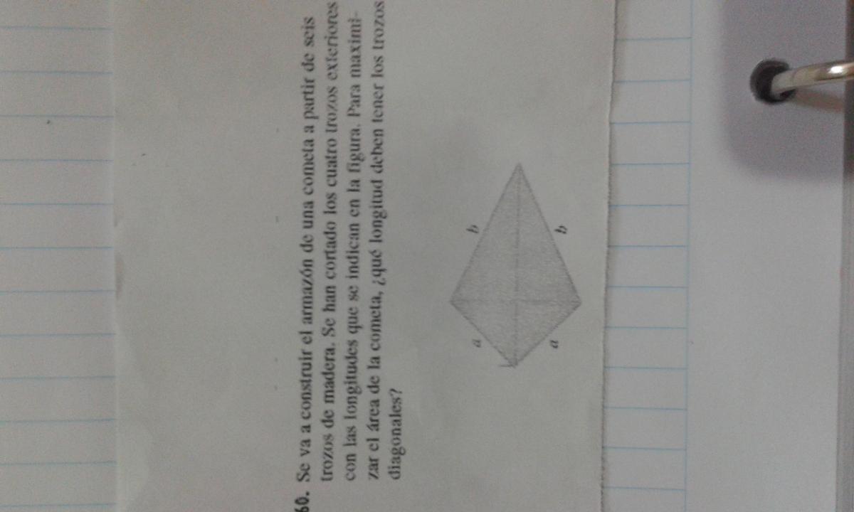 Te sugiero los vídeos de OPTIMIZACION. En tu caso, puedes plantear que la diagonal mayor está dividida en dos trozos: x(el más pequeño) e y(el más grande). Por ello la diagonal mayor será x+y... Y la diagonal menor será 2x.... Por Pitagoras puedes deducir que x²+x²=a²..... 2x²=a²... √2. x = a... x=a/√2......