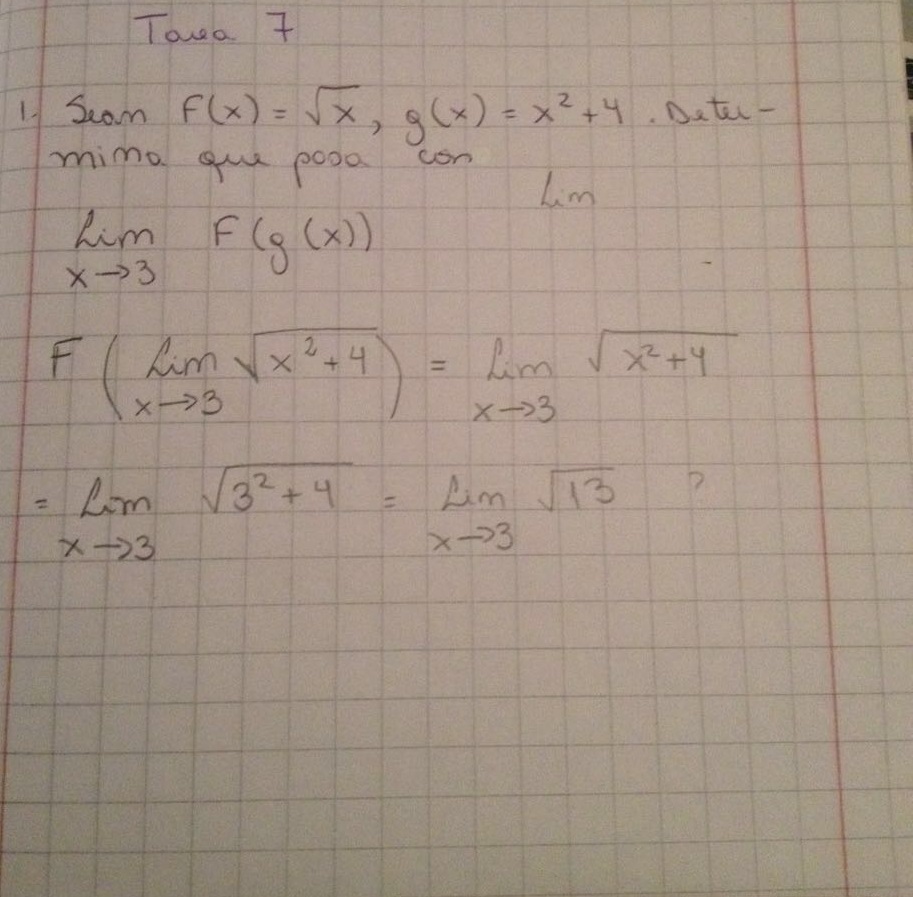 Para justificar: observa que la función g es continua para x=3 y que g(3) = 13 , y que la función f también es continua para x=13 y que f(13) = V(13), por lo tanto puedes aplicar la propiedad del límite para una función continua: