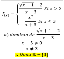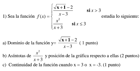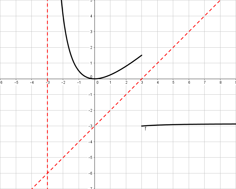 Estudiar la continuidad para x=-3. Nos fijamos en el segundo trozo de la función que es para x≤3 (se incluye el -3). Como se nos anula el denominador, tenemos que el límite de esa función en x=-3 es infinito, tenemos una asíntota vertical, por lo que la función es discontínua y de salto infinito e inevitable.