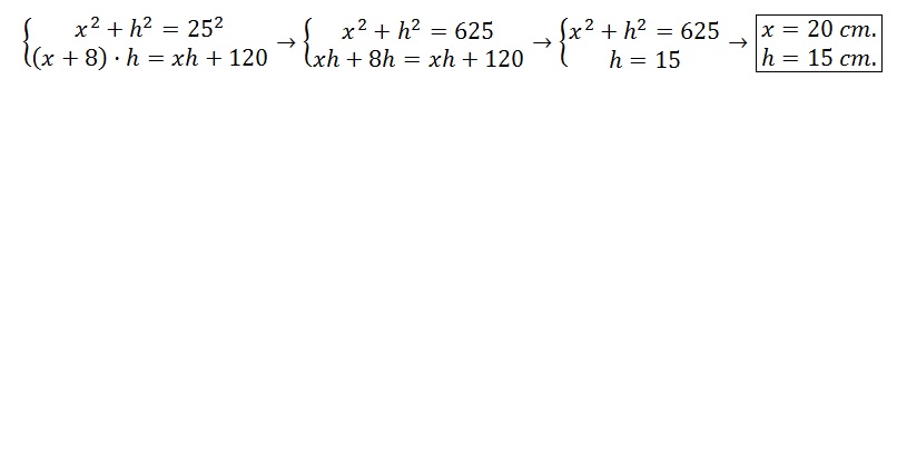 Esta bien el planteamiento de este sistema: 25^2 =(8+x)^(2) + h^2 y la segunda del sistema 120= [(8+x)(h)]/2