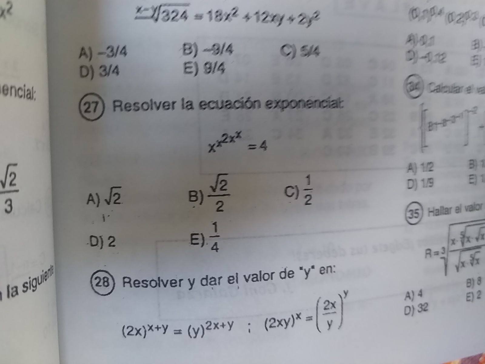 La expresión más simplificada sería x^(2x³) pues la potencia de una potencia se hace multiplicando los exponentes.. A partir de ahí, al ser tipo test, te sugiero intentes comprobar si es cierto para todos los valores que te dan ... Desde luego, el 2 lo descarto... Pero tendrás que ver si, por ejemplo, para la solucion c= 1/2.... se cumple... Te quedará... (1/2)^(2.(1/2)³=4...... En ese caso (2^(-1))^(1/4)= 2².... 2^(-1/4) = 2².. que no es cierto....