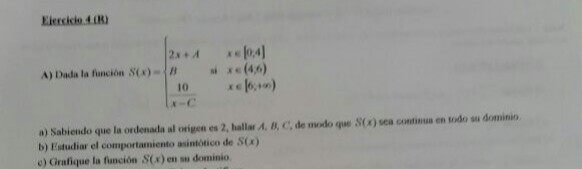 y observa también que el primer trazo es continuo en [0,4], que f(4) = 2*4 + A = 8 + A = 8 + 2 = 10.