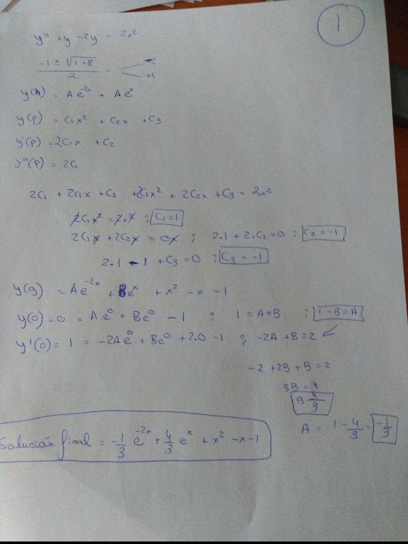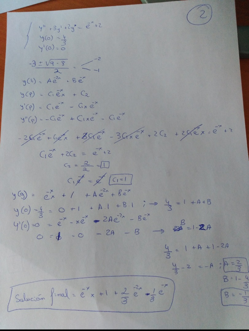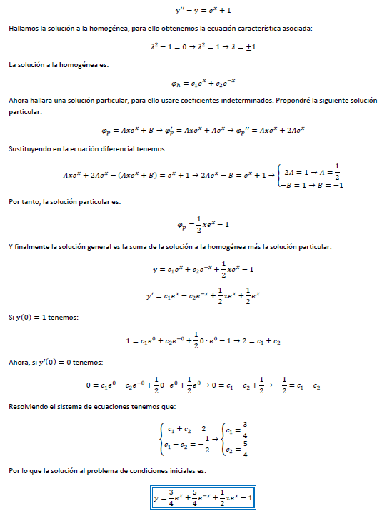 Para la solución a la homogénea, al ser raíces reales diferentes la solución es de la forma c₁ e^(λ₁ x)+c₂ e^(λ₂ x)