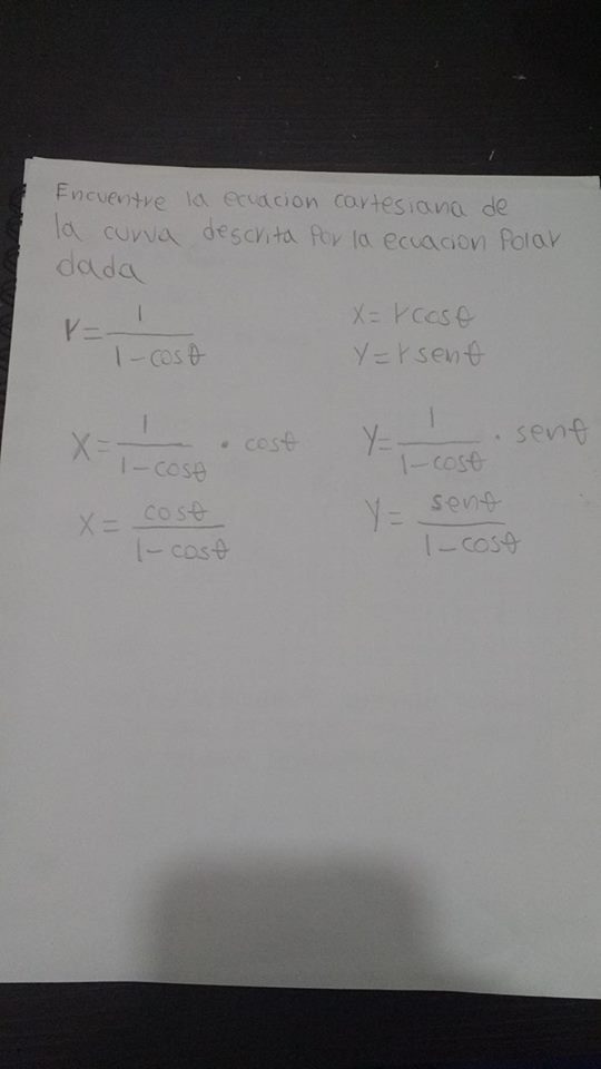 Nuevamente se que tengo que usar las identidades trigonométricas pero al llegar a cosθ/1-cosθ la unica identidad trigonométrica que veo que mas se asemeja es cosθ/√1-cos²θ y así podría decir que x=cotθ pero nose como hacer para transformar cosθ/1-cosθ en eso, por el lado de la Y si estoy completamente perdido en cuanto a que procedimiento llevar a cabo... Se agradece mucho cualquier tipo de ayuda