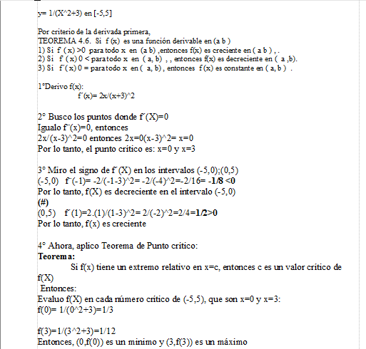 Unicos, me podrán decir si esta bien resuelto el siguiente ejercicio, la consigna es Para cada una de las siguientes funciones, hallar los puntos críticos y luego analizar si tienen máximos y mínimos absolutos en los intervalos que se indican; los intervalos no indicados se sobreentienden como todo el campo de existencia de la función de la función