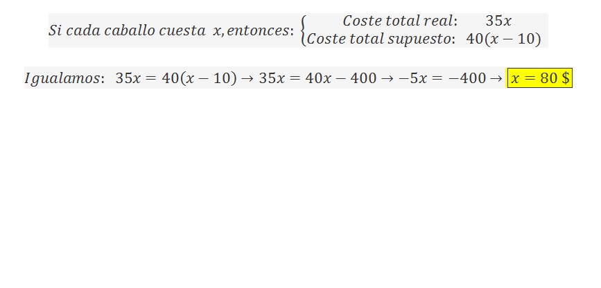 hay algo que no me queda claro, entiendo que si hubiera comprado 40 caballos , cada uno le hubiera salido 10$ menos, entonces no los compra al mismo precio, dado que costaran 10 menos cada uno. lo cual el segundo precio es x-10 pero no pueden costar los 40 caballos igual que los 35 caballos, no me parece lógico. no profesor? eso es algo que no entiendo, espero me podría explicar esta duda. se lo agradecería.