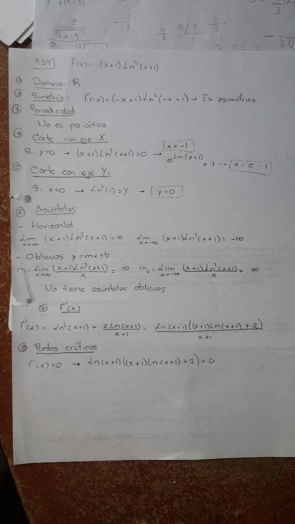 Hola, necesito ayuda con este ejercicio. Tengo que graficar esta función pero no se si mis puntos de cortes esten bien o si la derivada la saque bien y al evaluar los puntos criticos me enrede... Si me pueden dar una idea de como seria la grafica seria genial.