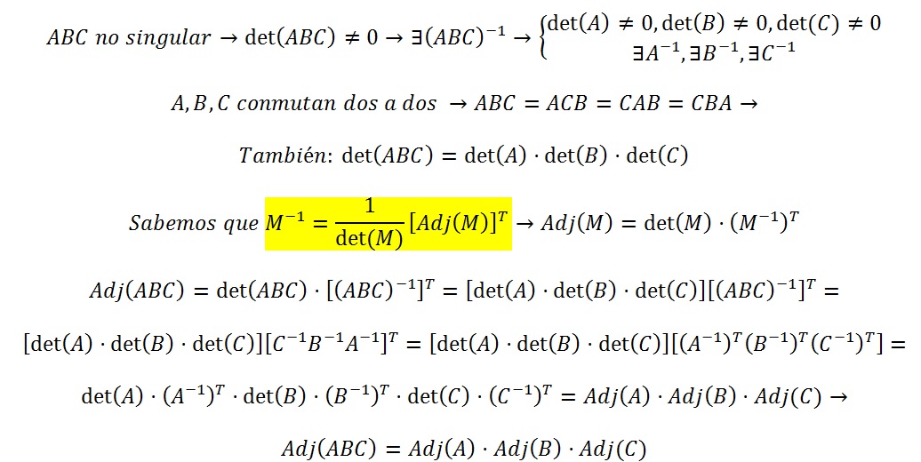 Demostrar que Adj(ABC) = Adj(A) × Adj(B) × Adj(C)
