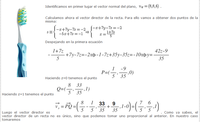 Y para identificar dos puntos de la recta, simplemente se eligen dos valores para z, y en este caso han elegido z = 0, y z = 1 (observa que podrían haber elegido cualquier otro par de números reales). Con ellos obtienen dos puntos de la recta, y a partir de ellos obtienen finalmente las componentes del vector director de la recta.