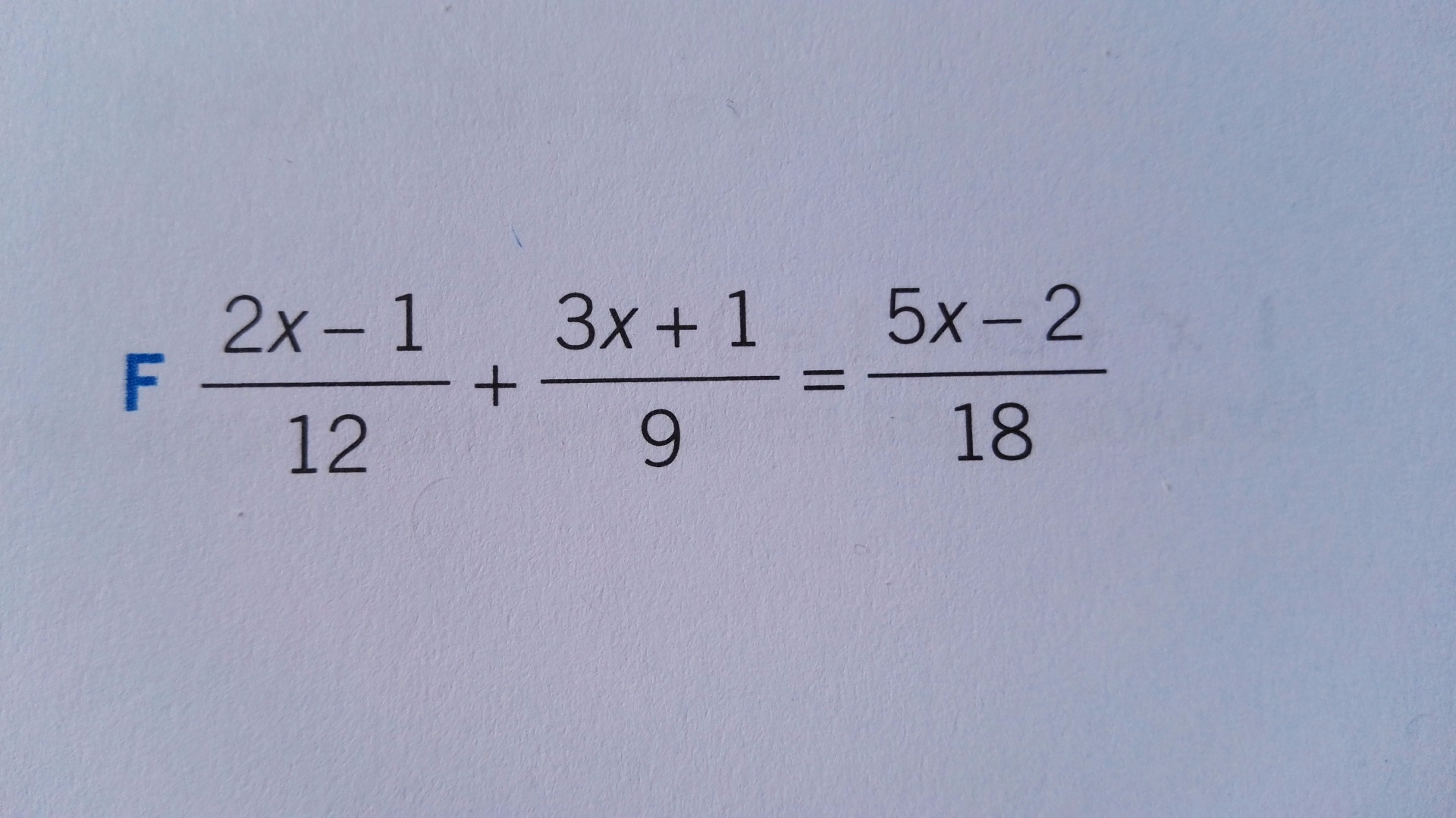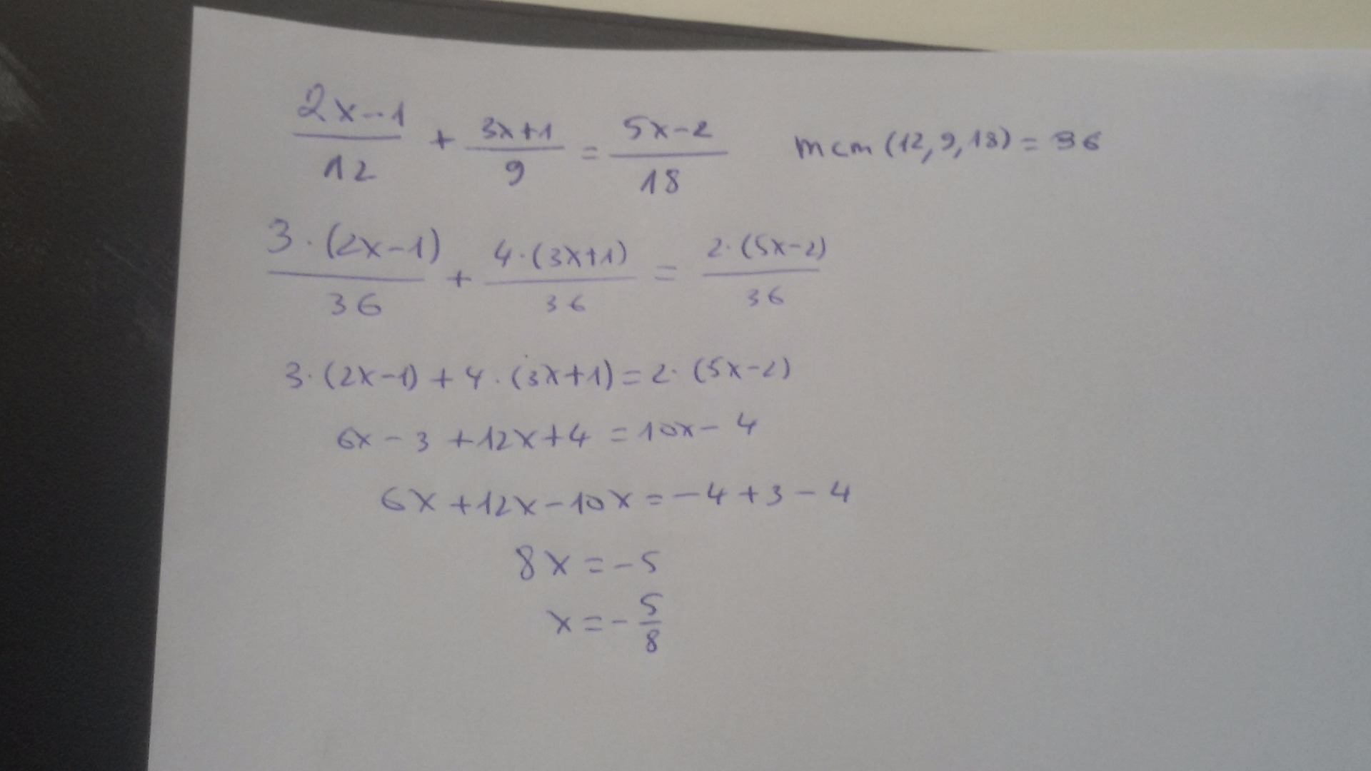 18x-9+36+12 y denominador 108. Una vez aquí, en la igualdad multiplico 108 por 5x-2 y 18 por 18x-9+36+12. Hago la sumas y restas pertinentes y mi solución es x= 162:432.