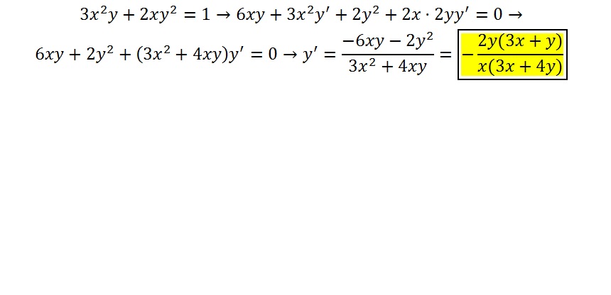 Hola Unicos!!. Una consulta, me han dado el siguente ejercicio de derivadas implícita: 3x^2y+2xy^2=1