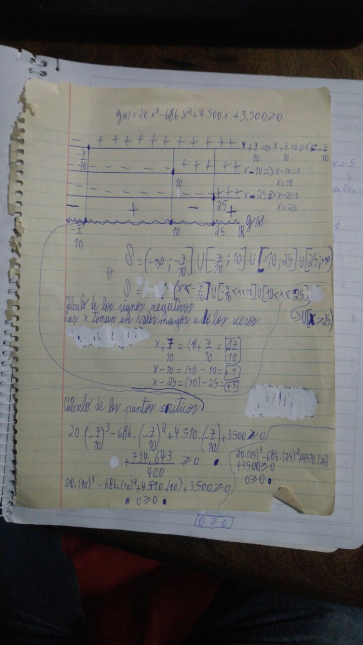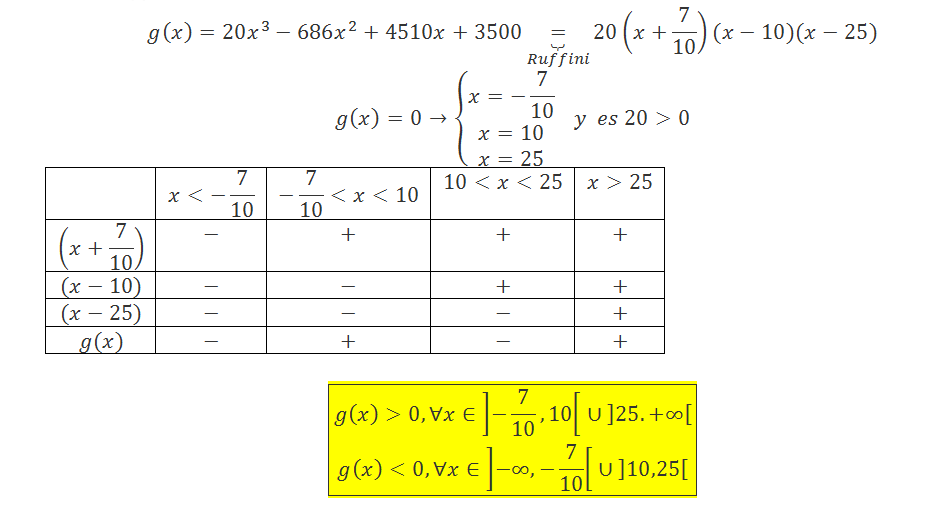 Ceros: {-7/10; 10; 25) , la función escrita en función de sus ceros: g(x)= 20. (x+7/10) . (x-10) . (x-25) y la funcion reducida mediante Ruffini g(x)=20 . x^2 -- 700 . x + 5.000