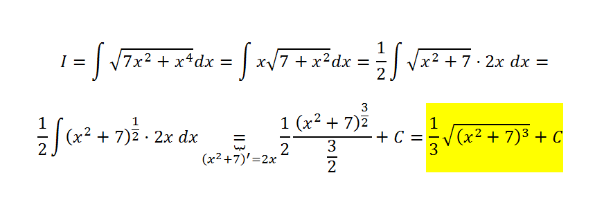 w = 7 + x2, de donde tienes: dw = 2*x*dx, de donde puedes despejar: (1/2)*dw = x*dx,