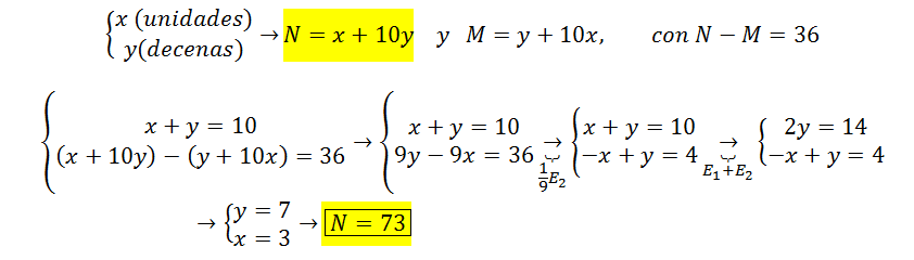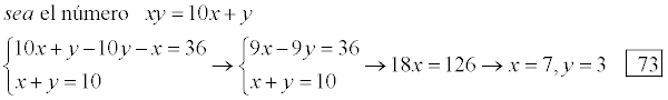 Buenos días. Alguien me podría solucionar este problema? Se q la solución es 73 pero no consigo la manera de hacerlo. El enunciado es: la diferencia entre un número y el q resulta de invertir sus cifras es 36, y la suma de las mismas es 10. Calcula dicho número.