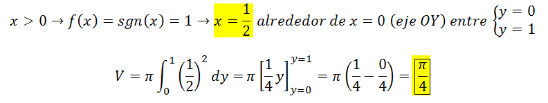 Luego, el volumen de revolución generado al rotar el rectángulo alrededor del eje OY queda (indicamos con corchetes que debemos evaluar con Regla de Barrow entre y = 0 e y = 1):